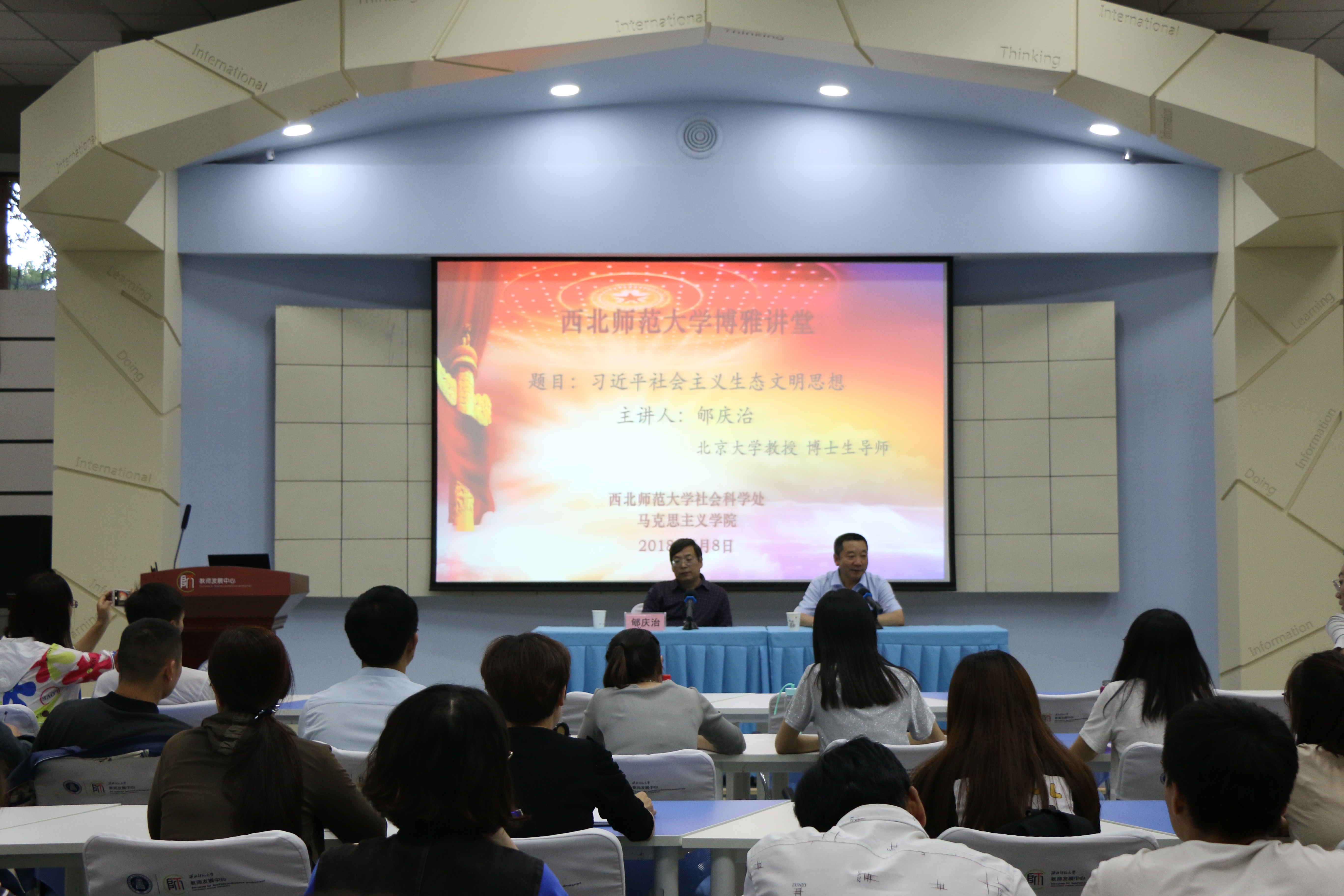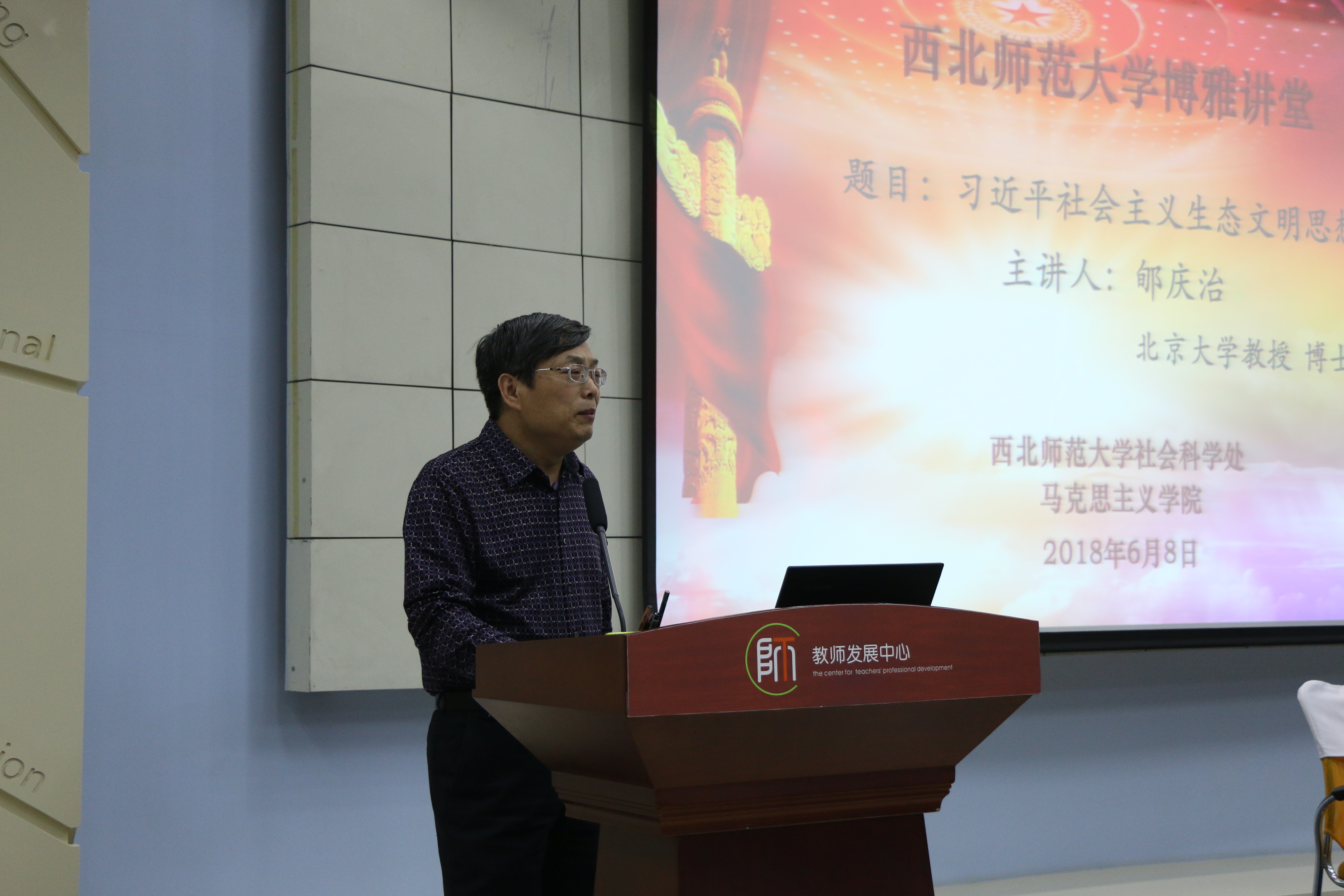 2018年6日8日晚,德赢vwin体育官网登录博雅讲堂在教师发展中心二楼举行。学院邀请北京大学郇庆治教授作题为“习近平社会主义生态文明思想”的讲座,讲座由院长王宗礼教授主持。