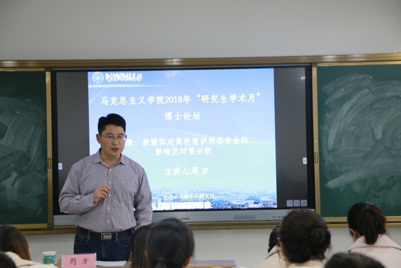 2018年11月9日晚,德赢vwin体育官网登录2018年“研究生学术月”博士论坛在教学7号楼510教室举行。周方博士作题为《新媒体对高校意识形态安全的影响及对策分析》的报告,德赢官网博、硕研究生参加了本次报告。
