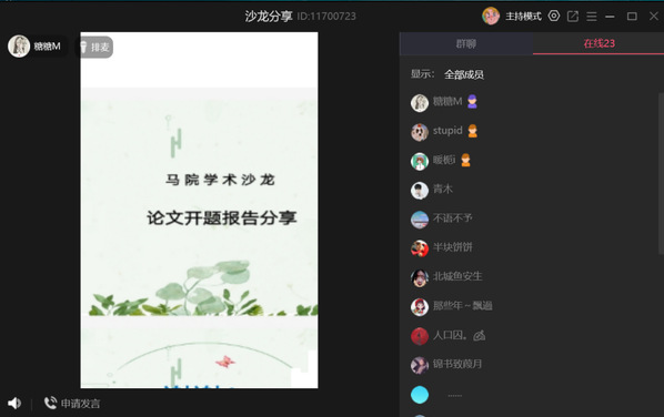 为贯彻落实学校关于做好疫情防控期间教学工作,营造学院良好的学术氛围,学院提倡研究生通过开展线上学术沙龙活动以保障学术交流活动的顺利开展。马克思主义学院18级本硕一体生于2020年3月12日下午3点,3月13日下午4::30自发组织了两场以“论文开题报告”为主题的学术沙龙活动,学院 19级本硕一体生也参与了两次交流活动。