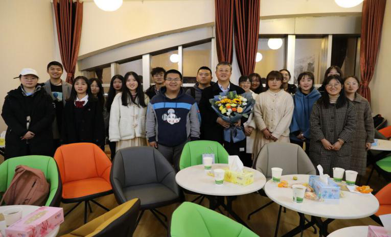 活动最后,学生会同学为王老师献花并邀请王老师和同学们合影留念。