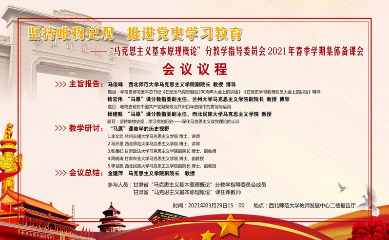 为深入贯彻落实习近平总书记在学校思想政治理论课教师座谈会上的重要讲话精神,根据中共甘肃省委教育工委《关于组织开展甘肃省大中小学思政课教师“同上一堂党史课”集体备课会的通知》,结合习近平总书记在党史学习教育动员大会上的讲话精神,由中共甘肃省委教育工委思政处、甘肃省“马克思主义基本原理概论”分教学指导委员会主办,德赢vwin体育官网登录教师发展中心、德赢vwin体育官网登录承办,于2021年3月29日15:00在德赢vwin体育官网登录教师发展中心二楼报告厅召开“坚持唯物史观,推进党史学习教育——‘马克思主义基本原理概论’分教学指导委员会2021年春季学期集体备课会”。