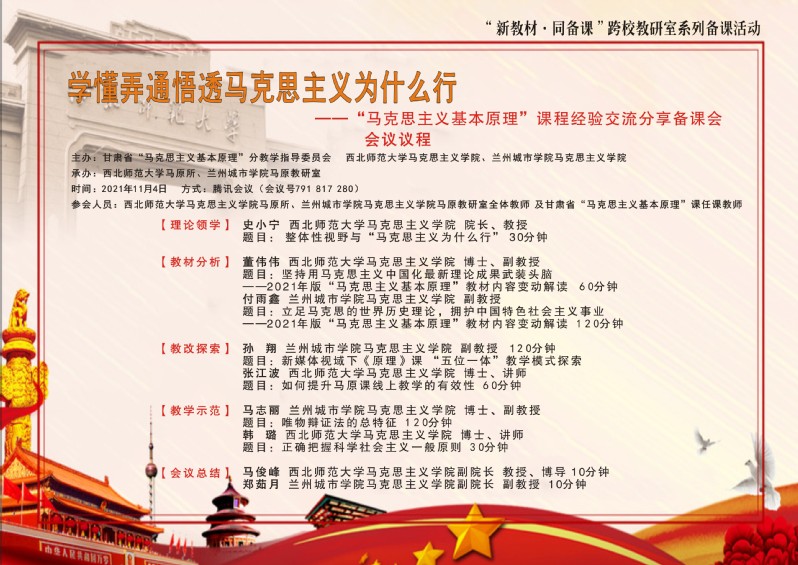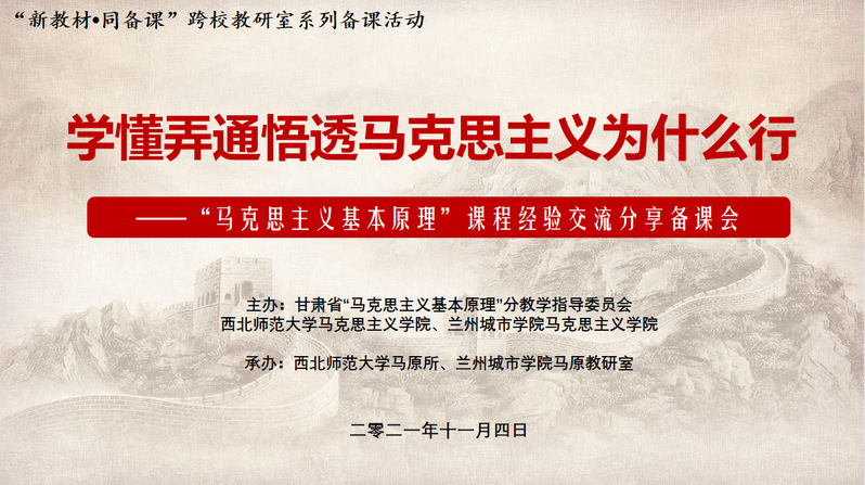 2021年11月4日下午,由甘肃省“马克思主义基本原理”分教学指导委员会,德赢vwin体育官网登录、兰州城市学院德赢vwin体育官网登录联合主办,德赢vwin体育官网登录马原所、兰州城市学院马原教研室具体承办的“学懂弄通悟透马克思主义为什么行——‘马克思主义基本原理’课程经验交流分享备课会”顺利召开。此次集体备课会为“新教材•同备课”跨校教研室系列备课活动之一。由于疫情原因,此次会议以线上形式开展。