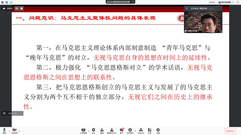 在教改探索环节,兰州城市学院马原教研室主任孙翔副教授,德赢vwin体育官网登录张江波老师分别以“新媒体视域下《原理》课 ‘五位一体’教学模式探索”,“ 如何提升马原课线上教学的有效性”为题,从宏观建构、微观透视两个视角,全面分享了在“新媒体”背景下,通过整体规划、细节谋划提升线上马原课教学有效性的方法与经验。