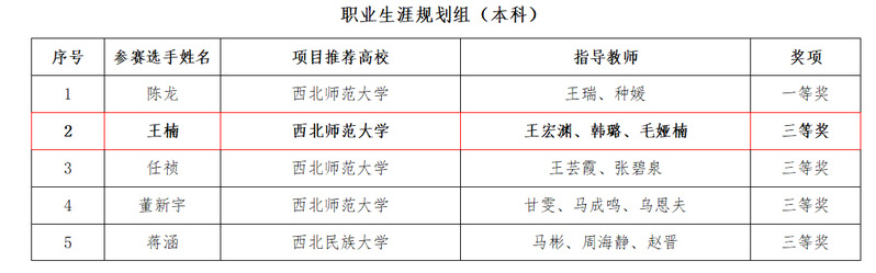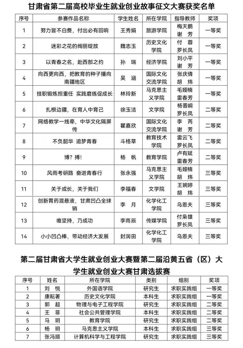 林玲新、张永强分别获得甘肃省第二届高校毕业生就业创业故事征文大赛一等奖和三等奖。杨玥、王楠同学分别取得了甘肃省就业创业大赛暨第二届沿黄五省(区)大学生就业创业大赛甘肃选拔赛求职实践组三等奖和职业生涯规划组三等奖的好成绩。