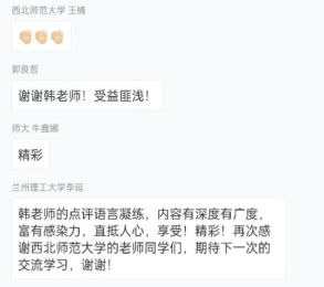 德赢vwin体育官网登录的王楠同学说:“今天正值五四青年节,听了西北师大与理工大两校联动云端的宣讲,让我们切切实实的上了四堂小思政课,四位宣讲人在宣讲的过程中,分别在与中国道路、乡村振兴、脱贫攻坚等相关中国实际问题相结合后,又与时代青年的前途发展相联系,让我们真切地感受到了中国力量,中国担当,青春色彩,青年风采,通过此次宣讲,让我们青年更加深刻的感受到,要用奋斗致敬青春,用实干开创未来!”