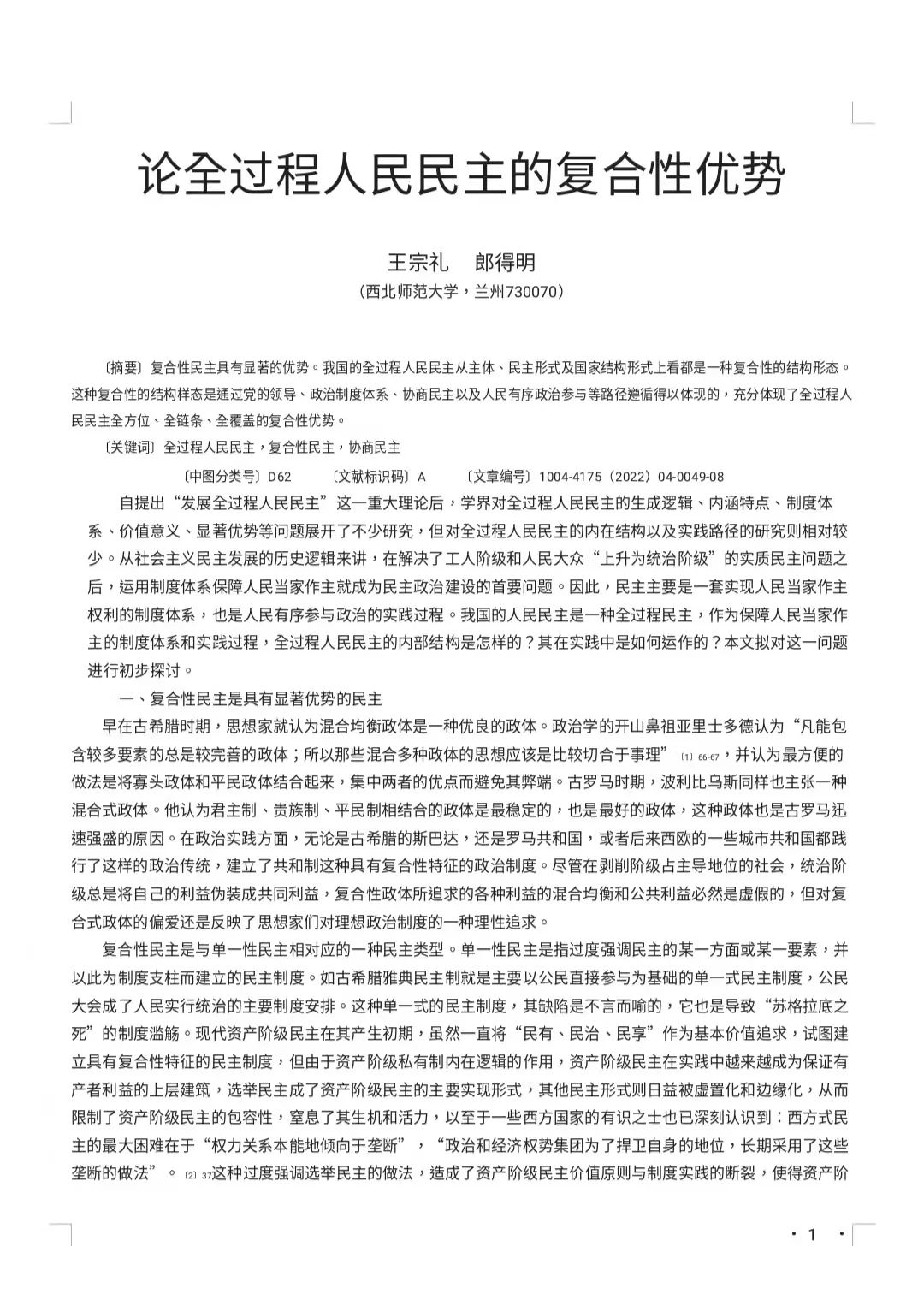 今日推文来源:《理论探索》2022年第4期发表德赢vwin体育官网登录王宗礼教授文章《论全过程人民民主的复合性优势》。