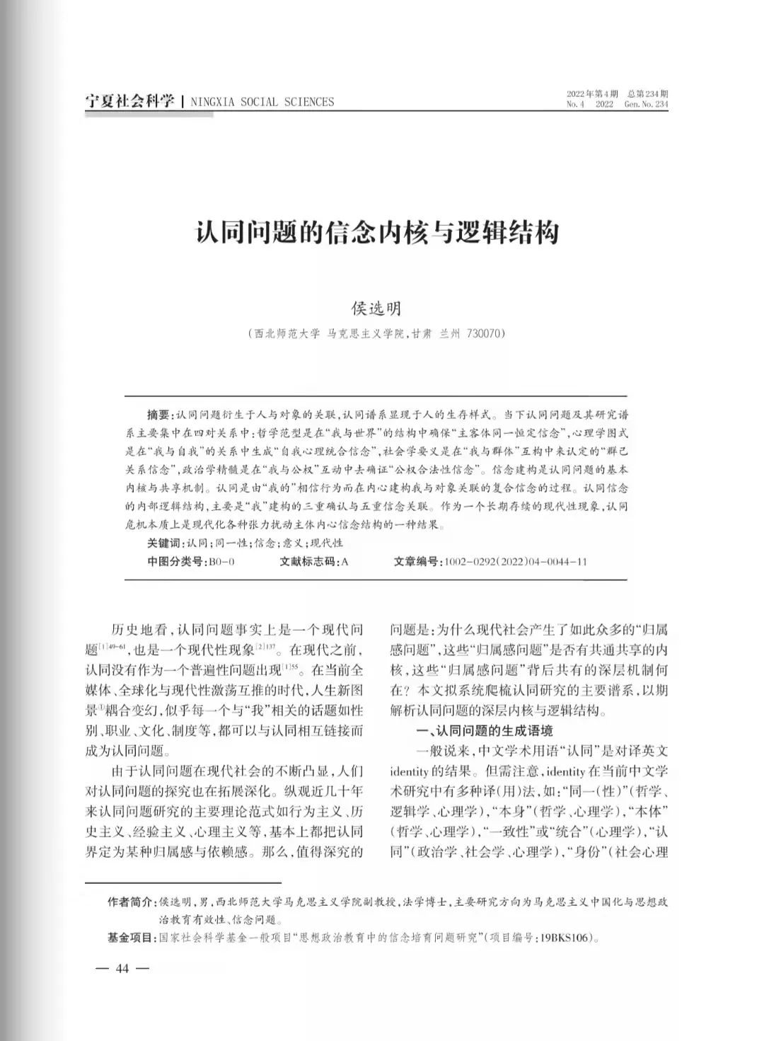 《宁夏社会科学》2022年第4期发表德赢vwin体育官网登录侯选明副教授文章《认同问题的信念内核与逻辑结构》。
