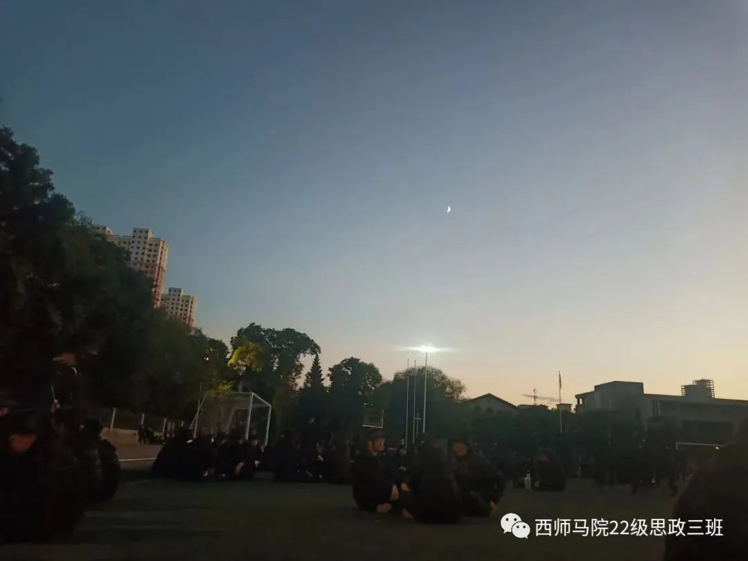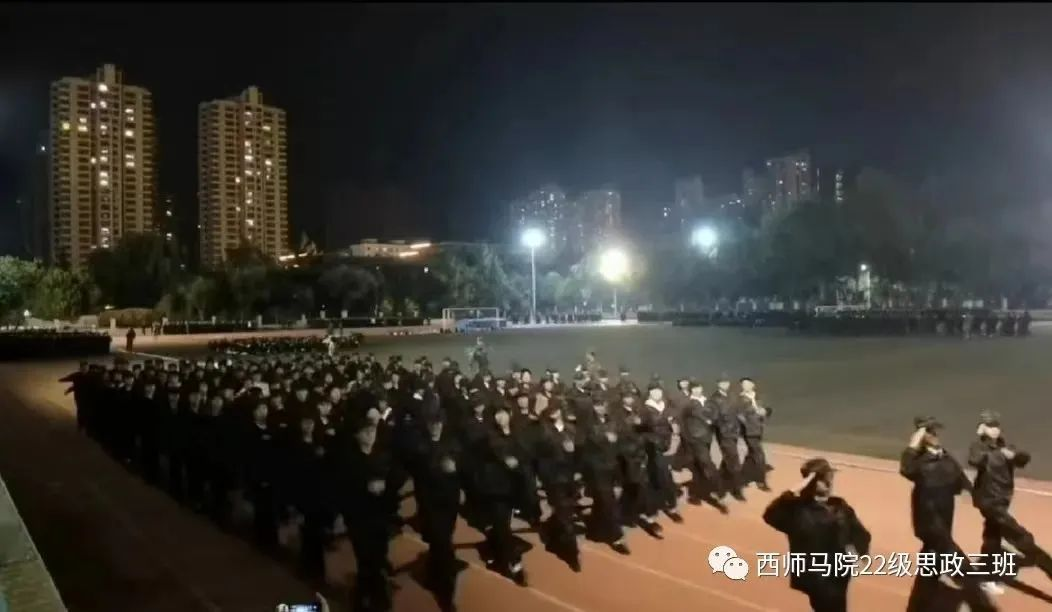 夜幕降临,璀璨的路灯下,同学们仍然精神饱满,一丝不苟地练习着列队动作,脚下的影子是最好的见证和陪伴。