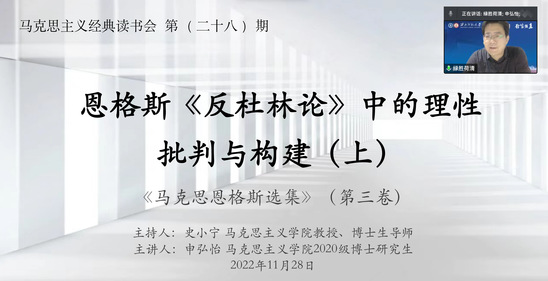 2022年11月28日晚,第二十八期马克思主义经典读书会在腾讯会议线上举行。2020级博士研究生申弘怡以《恩格斯<反杜林论>中的理性批判与构建》为题,对《反杜林论》进行文本分析。读书会由学院院长史小宁教授主持,学院百余名硕博士研究生通过线上方式参加。