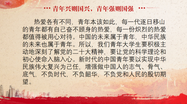 百年风雨初心如磐,百年征程笃定前行。中国共产党历经风风雨雨,赢得了如今的辉煌成就。党的二十大的精神让我明白:生逢其时,当不负时代、不负党、不负国家、不负人民,埋头苦干、奋勇前进,坚定不移听党话、跟党走,让青春之花绽放在祖国最需要的地方,为全面建设社会主义现代化国家,全面推进中华民族伟大复兴而团结奋斗!