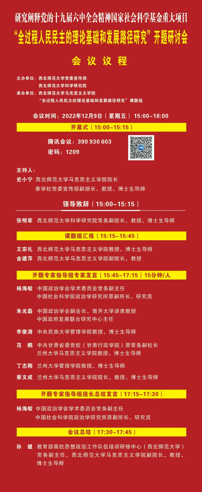 为深入学习宣传贯彻党的二十大精神,进一步深入研究全过程人民民主的理论基础和发展路径,总结回顾中国特色社会主义民主政治建设经验和规律,深刻把握全过程人民民主的本质特征与实践要求,提升社会主义民主政治理论研究的战略性、前瞻性、科学性,更好地为全面建设社会主义现代化国家提供理论支撑,坚定不移走中国特色社会主义政治发展道路。由德赢vwin体育官网登录党委宣传部、德赢vwin体育官网登录科学研究院主办,德赢vwin体育官网登录、“全过程人民民主的理论基础和发展路径研究”课题组承办的“全过程人民民主的理论基础和发展路径研究”开题研讨会将于2022年12月9日(周五)下午3时以线上会议方式举行。