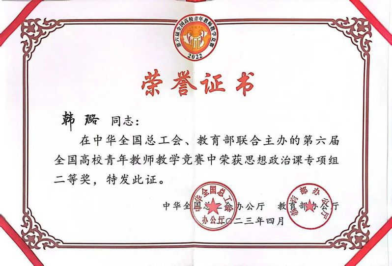 4月24日,由中华全国总工会、教育部联合主办的第六届全国高校青年教师教学竞赛决赛结果出炉。德赢官网教师韩璐以甘肃省第六届青年教师教学竞赛思政组第一名的身份代表甘肃省参加全国决赛,最终取得全国决赛思政课专项组二等奖(第六名)的好成绩,为学院赢得了荣誉,实现了学院在国家级教学比赛中的历史性突破!