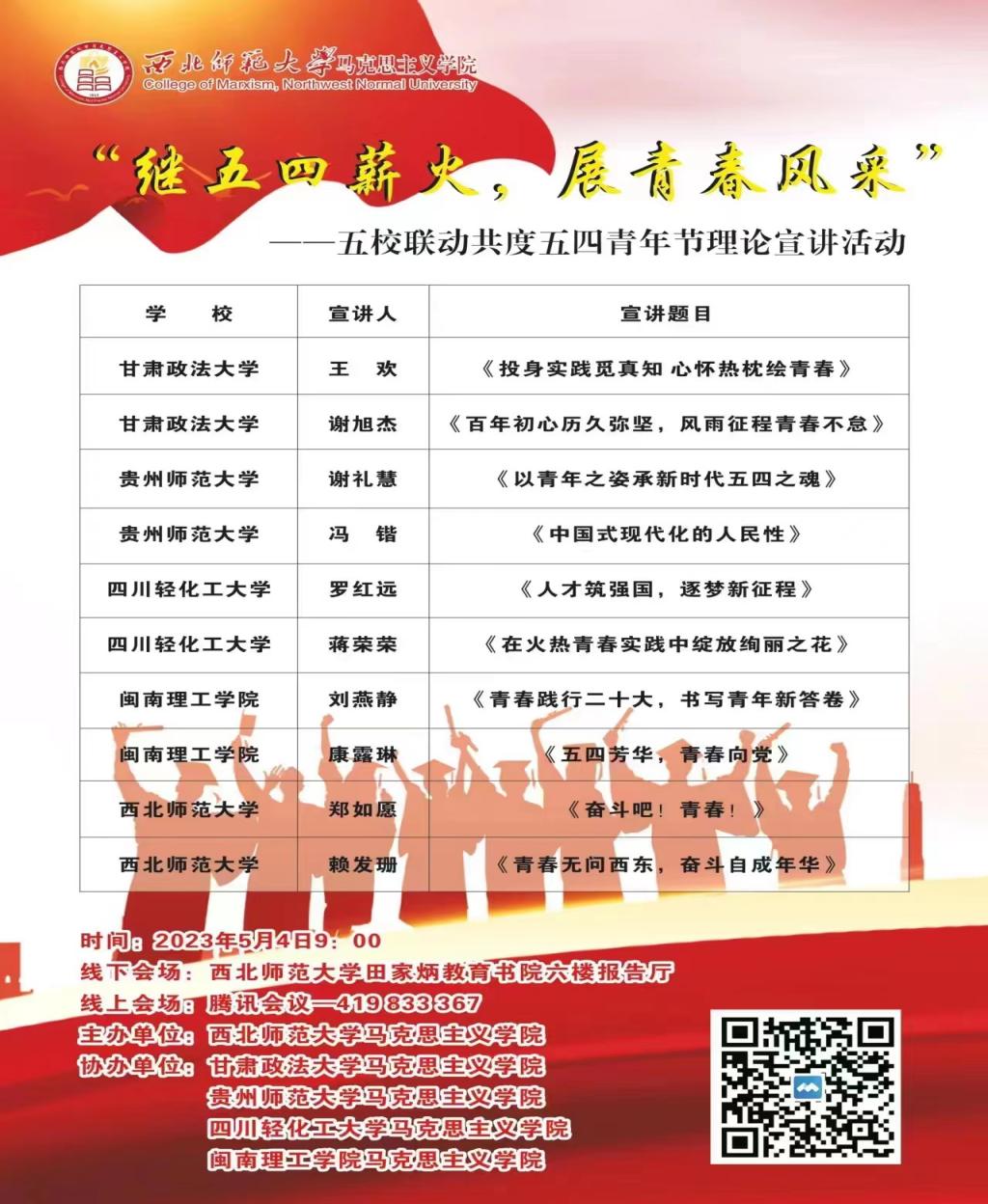 正值五四爱国运动104周年暨建团101周年,为赓续传承五四“爱国、进步、民主、科学”的精神,培养青年学生的使命感与责任感,坚定团员青年走社会主义道路的理想信念,展示新时代青年奋发进取的精神面貌,2023年5月4日,德赢vwin体育官网登录将邀请甘肃政法大学、贵州师范大学、四川轻工业大学、闽南师范学院四所高校青年学子,以线上线下相结合的方式展开一场理论宣讲交流活动,抒发青年志向,共负使命担当,一起度过一个有意义的五四青年节!