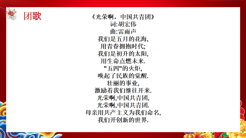 为了加强团员意识教育,增强团组织的凝聚力和战斗力,德赢vwin体育官网登录团委组织全院同学学习了习近平总书记在庆祝中国共产主义青年团成立100周年大会上的重要讲话,积极开展团旗、团歌学习,广大学子围绕讲话开展研讨交流,大家纷纷表示倍感振奋、备受鼓舞,将牢记习近平总书记殷殷嘱托,把忠诚书写在党和人民事业中,争当伟大理想的追梦人,争做伟大事业的生力军,在新征程上踔厉奋发、担当奉献,为奋力谱写新时代、新师范、新使命发展篇章贡献青春力量。