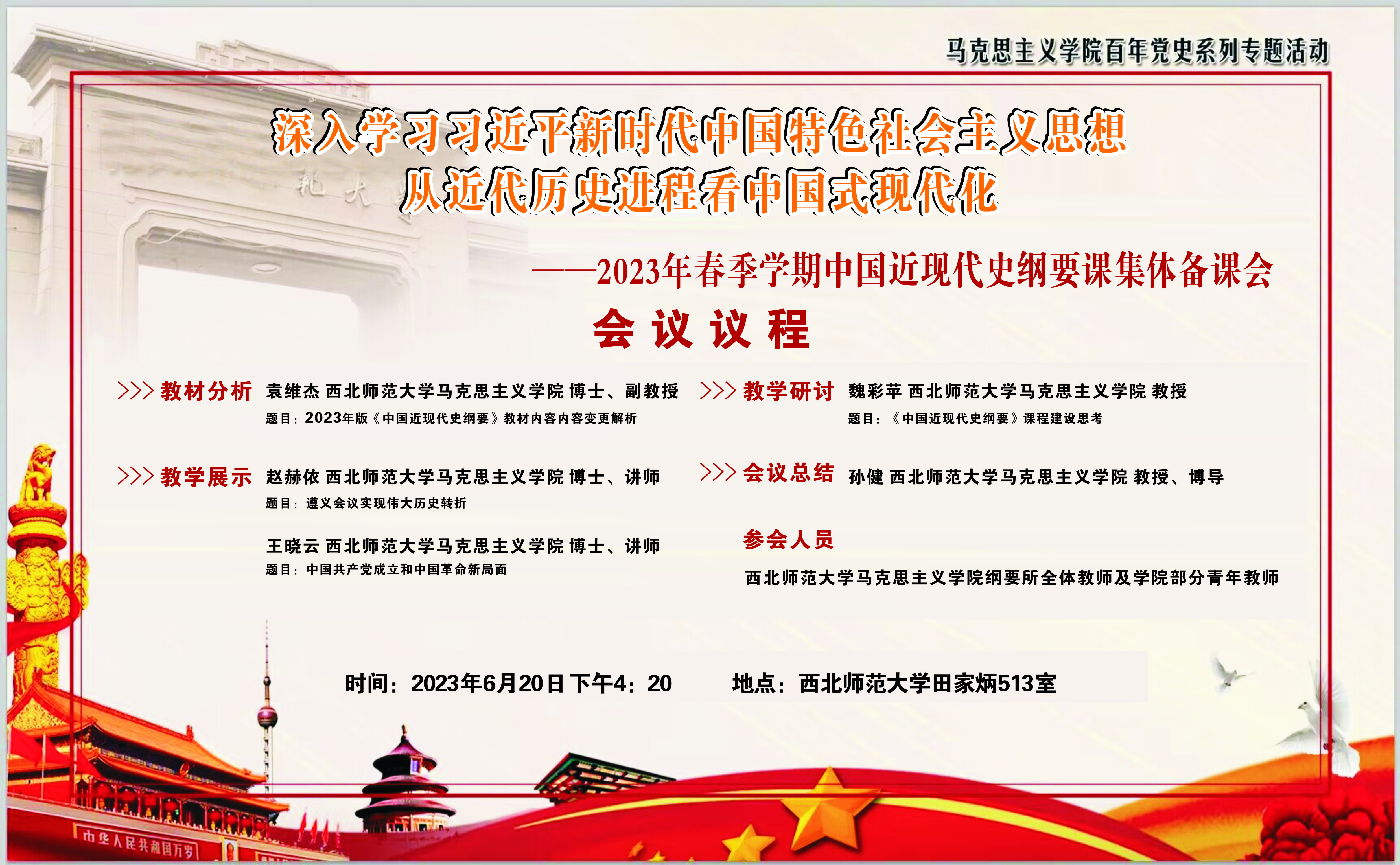 6月20日下午,德赢vwin体育官网登录中国近现代史纲要研究所全体教师及兼职教师召开了“深入学习习近平新时代中国特色社会主义思想——从近代历史进程看中国式现代化”为主题的集体备课会。此次备课会由中国近现代史纲要研究所所长闪兰靖副教授主持。