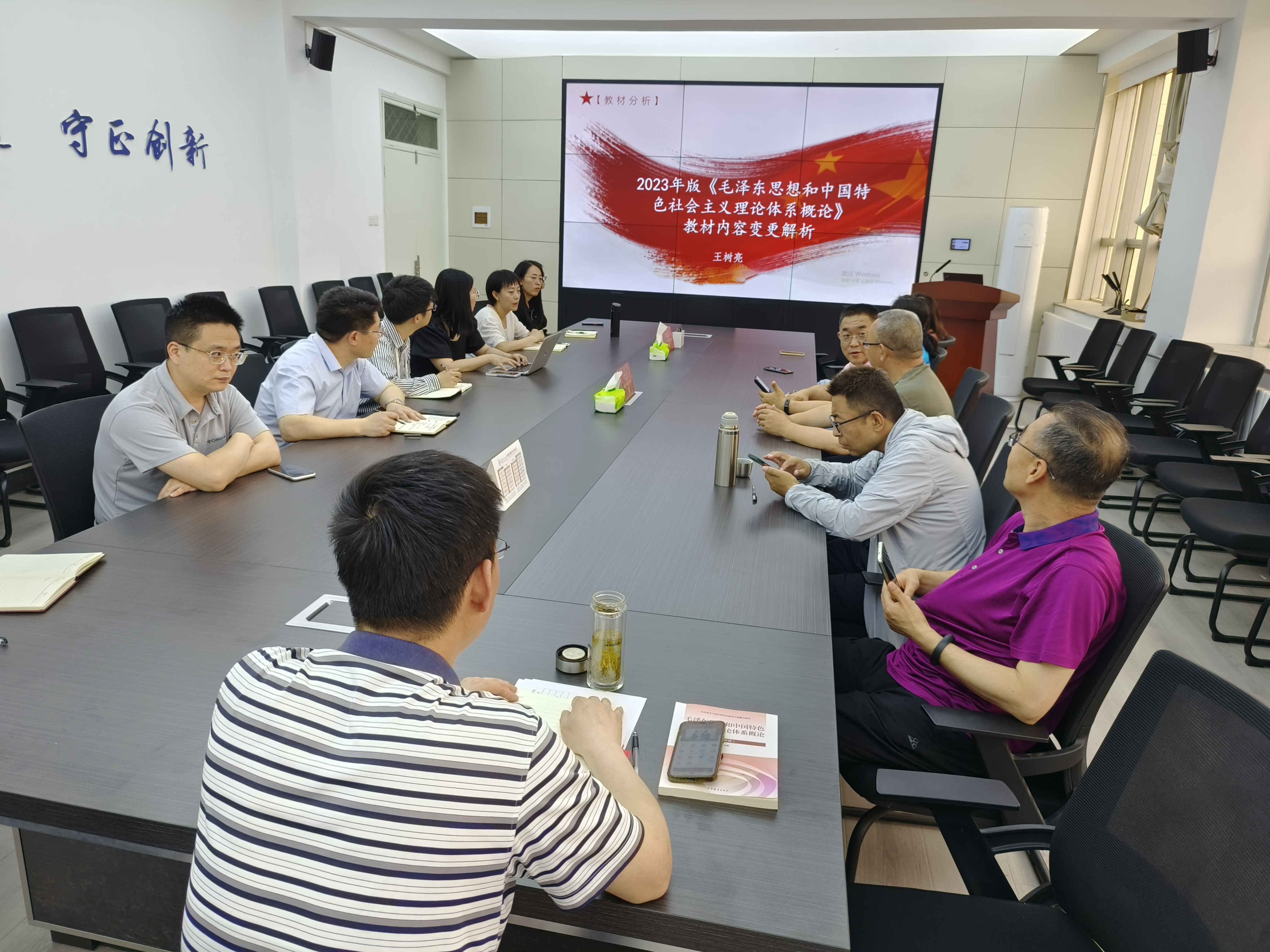 王树亮强调开好、讲好“毛泽东思想和中国特色社会主义理论体系概论”课程,是不断推进马克思主义中国化时代化的必然要求,是落实党的教育方针的必然要求,是实现立德树人根本任务的必然要求。基于2023年版新教材的调整变化、使用情况、教辅资料配备等方面,进行了说明,并要求要学好、用好新教材,深化教学方法改革,不断提升教学质量,始终围绕新时代十年伟大变革开发教学素材和资源,教师要具备讲深讲透讲活的业务能力,以达到提高入脑入心的育人效果,以更大力度推动课程建设。