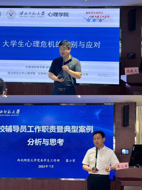 在研修班专题教学环节,西北师大党委学生工作部负责人慕小军,心理学院副院长、教授博士生导师康廷虎作专题报告。慕小军在题为《高校辅导员九大主要职责典型案例分析与思考》的专题报告中,结合工作经验和实际案例,深入简出的阐明高校辅导员的职责与使命;康廷虎在题为《大学生常见心理问题的识别与危机干预》的专题报告中从正确认知心理健康、大学生心理问题识别、心理危机干预等方面为学员讲解了辅导员做好大学生心理健康教育的相关理论与方法。此外,研修班还深入西北师大学生社区党工委、大学生餐饮文化中心等地,实地考察西北师大学生社区、党员活动及餐饮文化建设等相关情况。