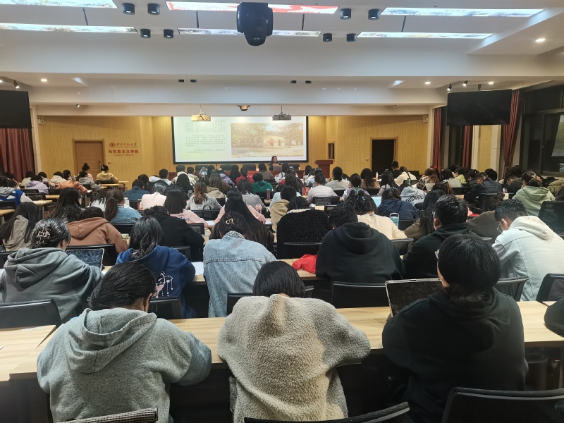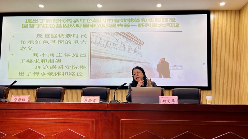 魏彩苹老师作了题为《习近平总书记关于传承红色基因重要论述研究》的报告。魏彩苹老师分别从梳理红色基因的生成轨迹、阐释红色基因的本质内涵、揭示传承红色基因的时代价值、探究传承红色基因的路径五个方面分析了传承红色基因的重要性。魏彩萍老师倡导同学们讲好中国的故事,讲好中国共产党的故事,传承好红色基因,为中华民族伟大复兴做出应有的贡献。