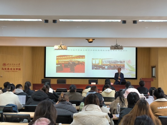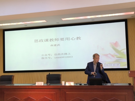 曲建武教授以习近平总书记关于思政课建设的重要论述导入,鲜明指出上好思政课的重要性和必要性。接着曲老师围绕“如何上好思政课”这一核心问题分四个方面展开讲座。首先,曲老师以中国共产党人在延安、在西柏坡等大量历史史实为支撑指出教好思政课必须要坚定理想信念。其次,曲老师指出教好思政课要增强理论素养,思政课教师不仅要有扎实的马克思主义理论基础,也要积极借鉴吸收中华优秀传统文化,更要注重强化政治意识、与社会实践相结合。另外,曲老师结合自身教育教学实践经验指出教好思政课要创新教学方法,创新要求思政课教师既要“吃透”学生,也要利用好新媒体、新技术,做好网络思想引领。最后,曲老师指出教好思政课要有仁爱之心,要想学生之所想、替学生着想,爱之而后教之。