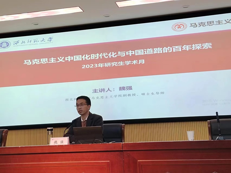 魏强副教授作了题为《马克思主义中国化与中国道路的百年探索》的报告。魏老师以百年党史发展为核心线索,分别从毛泽东思想与中国式现代化革命道路,中国特色社会主义理论与中国式现代化发展道路,习近平新时代中国特色社会主义思想与人类文明新形态三个维度介绍了中国共产党百年党史的发展进程与历史经验。最后,魏老师总结出中国化时代化的马克思主义和中国式现代化道路,不仅具有中国特色和中国价值,更具有深远的世界意义。中国式现代化是前无古人的一条道路,因而创造了人类文明新形态。