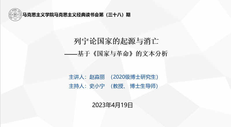 4月19日晚19:30,在田家炳教育书院607图书资料室举行了德赢vwin体育官网登录第三十八期马克思主义经典读书会。2020级博士研究生赵淼丽以《列宁论国家的起源与消亡-—基于<国家与革命>的文本分析》为题,对《国家与革命》中列宁关于国家起源与消亡问题的论述进行了文本解读。本次读书会由学院院长史小宁教授主持,学院六十余名博士硕士研究生参加了读书会活动。