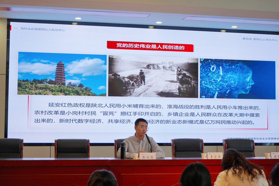 学院青年教师张成恩以“实事求是,与时俱进”为题讲授培训第一课。从中国走“农村包围城市,武装夺取政权”的革命道路、社会主义市场经济建设和人类社会命运共同体构建三个方面展开讲解,深入剖析了“实事求是,与时俱进”的时代内涵。张成恩勉励学员们筑牢理想信念,夯实理论功底,以饱满的热情、坚定的信念、扎实的学识迎接新时代的挑战,为实现中华民族伟大复兴的中国梦贡献自己的青春力量。