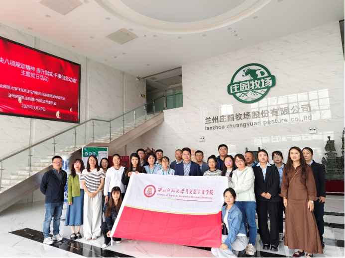 为加强高校与企业全方位交流合作,服务地方经济高质量发展,5月30日,德赢vwin体育官网登录马克思主义中国化研究所教师党支部联合形势与政策研究所,走进兰州庄园乳业有限公司,参观乳制品加工基地,实地感受企业以党建引领产业发展的生动实践,与企业党支部共同举办“内化中央八项规定精神 提升踏实干事创业动能”主题党日活动暨集体备课会。