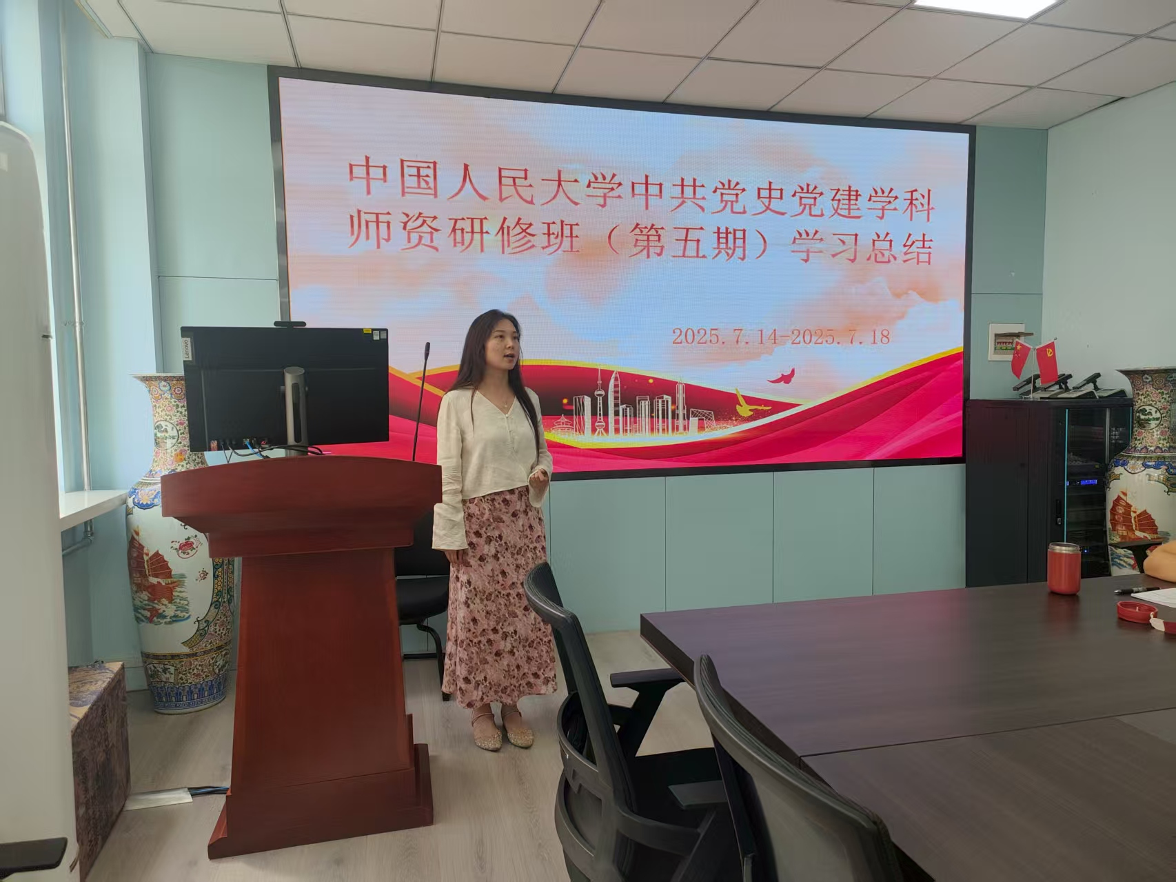 赵赫依副教授分享了参加中国人民大学党史党建学科建设师资培训班(第五期)培训的学习成果。她从党史研究前沿、党建理论创新、学术写作规范三方面汇报了学习收获,为教研团队分享了教学研究新思路。